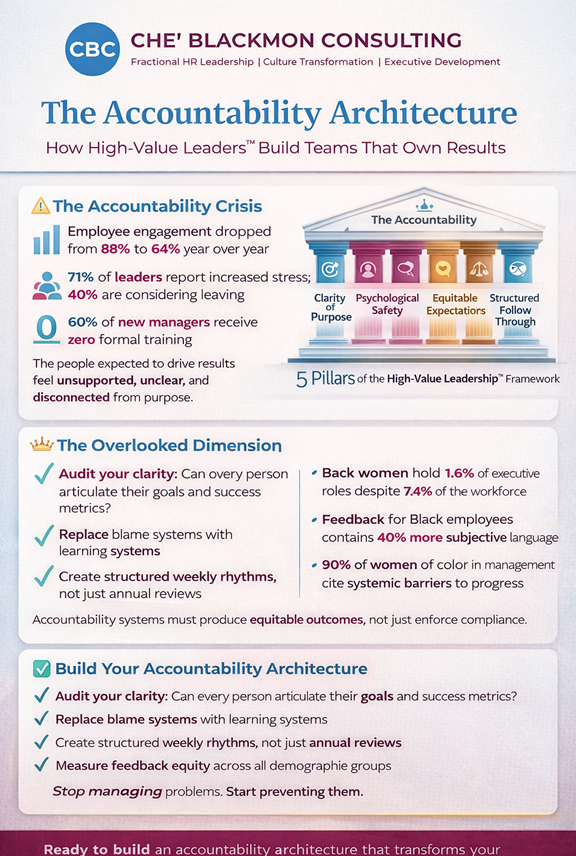 © 2026 Che’ Blackmon Consulting. All rights reserved. This article may be shared with proper attribution. #AccountabilityArchitecture #HighValueLeadership #HRLeadership #CultureTransformation #LeadershipDevelopment #FractionalCHRO #WorkplaceCulture #TeamAccountability #InclusiveLeadership #PeopleFirst #BlackWomenLead #EmployeeEngagement #HRStrategy #LeadershipTrends2026 #FractionalHR #ExecutiveDevelopment #PsychologicalSafety #FeedbackEquity #BlackWomenInBusiness #CheBlackmonConsulting