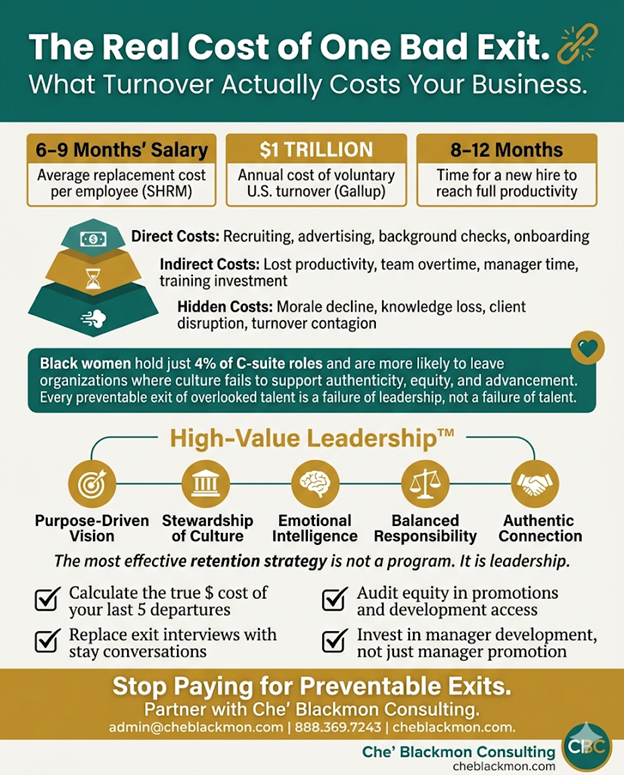 If you are ready to move from reactive recruiting to proactive retention, Che’ Blackmon Consulting can help. Through fractional HR leadership, culture transformation consulting, and leadership development rooted in the High‑Value Leadership™ framework, we partner with organizations to build cultures that attract, develop, and retain the talent they cannot afford to lose.
