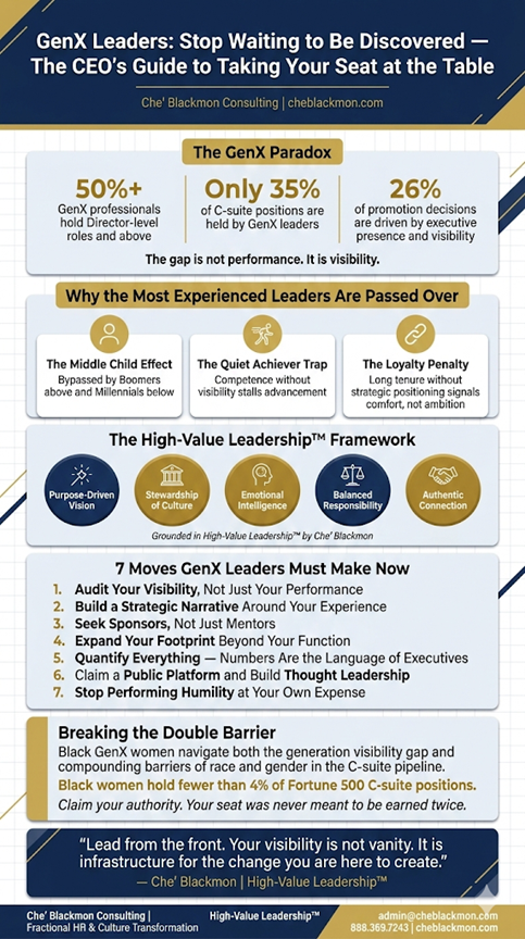 #GenXLeaders #ExecutiveLeadership #HighValueLeadership #LeadershipDevelopment #CareerAdvancement #BlackWomenLead #CultureTransformation #PeopleStrategy #VisibilityStrategy #WomenInLeadership #GenXProfessionals #HRLeadership #OrganizationalCulture #TakeYourSeat #CheBlackmonConsulting