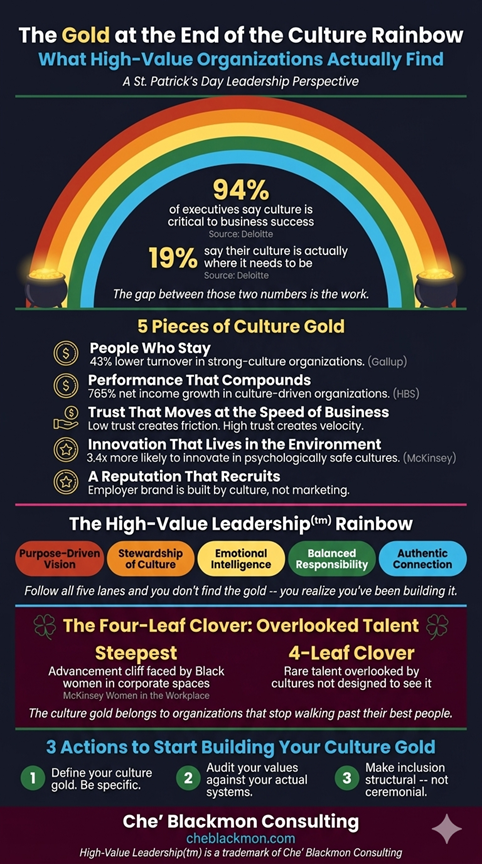#StPatricksDay #CultureIsStrategy #HighValueLeadership #CompanyCulture #LeadershipDevelopment #OrganizationalCulture #BlackWomenLead #WorkplaceCulture #HRLeadership #CultureTransformation #EmployeeRetention #InclusiveLeadership #PurposeDrivenLeadership #FractionalHR #CheBlackmonConsulting