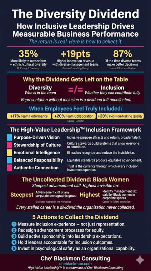 #DiversityDividend #InclusiveLeadership #DEI #HighValueLeadership #CompanyCulture #BlackWomenLead #WorkplaceBias #OrganizationalPerformance #HRLeadership #CultureTransformation #EmployeeEngagement #WorkplaceInclusion #LeadershipDevelopment #FractionalHR #CheBlackmonConsulting